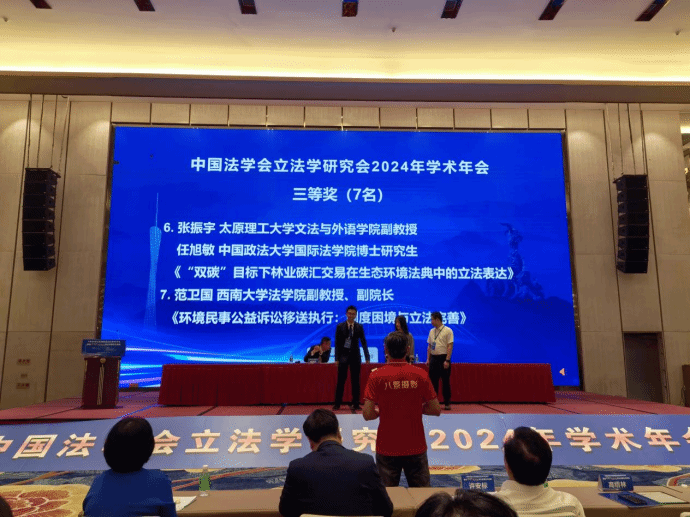 在学会年会闭幕式上,大会宣布了本次年会青年优秀成果奖名单并予以颁奖,张振宇和十大信誉法学专业2017级校友、中国政法大学国际法学院博士研究生任旭敏共同完成的论文《“双碳”目标下林业碳汇交易在生态环境法典中的立法表达》获中国法学会立法学研究会授予的青年论文奖三等奖,本次年会仅有15篇论文获奖。10月20日,在中国法学会环境资源法学研究会2024年学术年会上,该论文曾获中国法学会环境资源法学研究会授予论文二等奖。