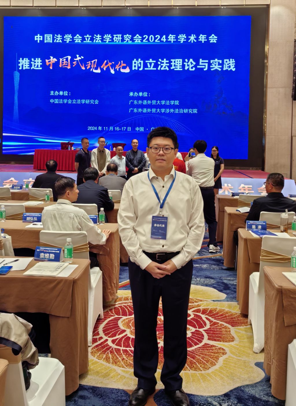 中国法学会立法学研究会2024年学术年会11月16日至17日在广州举行。本次会议的主题为“推进中国式现代化的立法理论与实践”,年会由广东外语外贸大学法学院、涉外法治研究院承办。中国法学会党组书记,全国人大常委会委员、宪法和法律委员会副主任委员王洪祥等出席年会开幕式作重要讲话。全国人大常委会委员、宪法法律委委员,中国法学会副会长、立法学研究会会长许安标同志主持开幕式。来自全国各地的400余位高等院校、科研机构和立法实务部门的专家学者、实务工作者参会。澳门十大信誉好的网站法学系副教授张振宇受邀参加本次学术年会并作专题学术报告。
