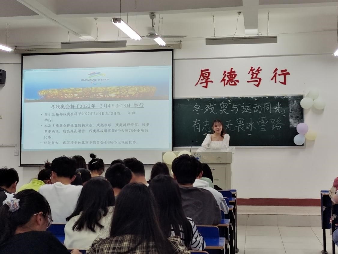 活动以PPT的形式讲解和科普了冬残奥会小知识,并详细地介绍了冬残奥的相关的运动项目和国内外知名运动员。随后,播放了视频,共同观看了选手表现的精彩瞬间。互动环节,同学们积极配合,主动参与游戏,现场气氛活跃。
