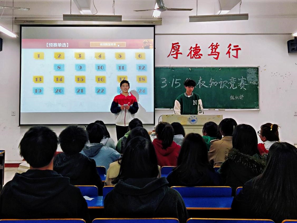 活动以知识竞赛和现场讲解的形式展开。比赛前,主持人着重讲解了经济领域的维权,介绍了市场规则、规范、市场监管行为等,让现场观众对维权有初步认识。比赛中,参赛选手思维敏捷,逻辑清晰,现场赛况激烈,气氛高涨。随后,组织部成员秉持着公平、公正、公开的原则,进行了等级评定,最终,A2121班以优异的成绩摘得桂冠。