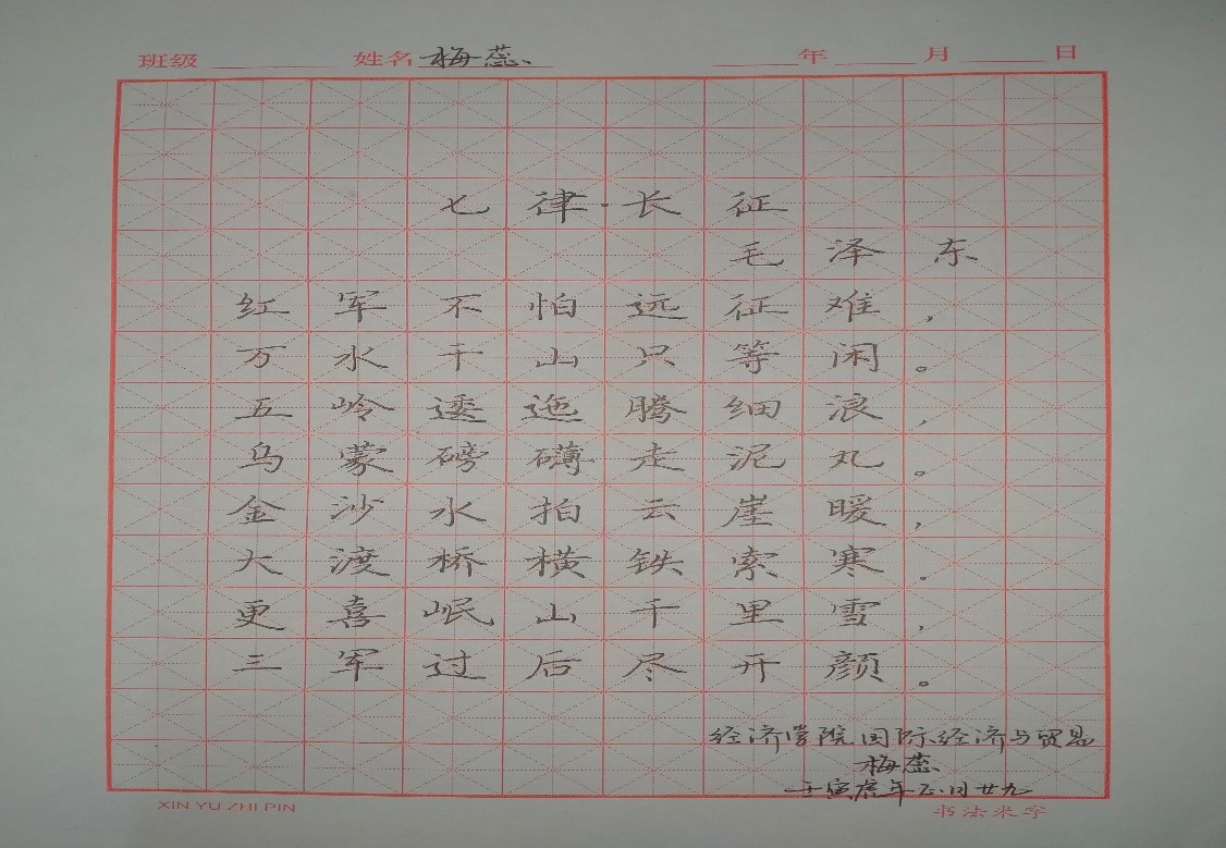 比赛中,各班级同学积极上交纸质作品,字体风格多样,运笔流畅,用心写好每一个汉字。赛后,国学社结合笔法、结构、字形等多方面进行了公平公正公开的评分和挑选。最终,A2123班梅蕊获得本次比赛的一等奖。