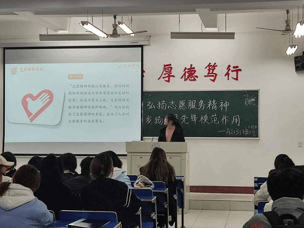 活动上,各班主讲人从理论出发,向同学们介绍了志愿服务精神,加深了同学们对志愿服务精神内涵的了解。随后,着重强调了团员先锋模范应具有的品质,并结合相关案例,阐述了在参与志愿活动中应表现出的精神。最后,呼吁全体同学,积极参与志愿服务活动,大力弘扬“奉献、友爱、互助、进步”的志愿服务精神。