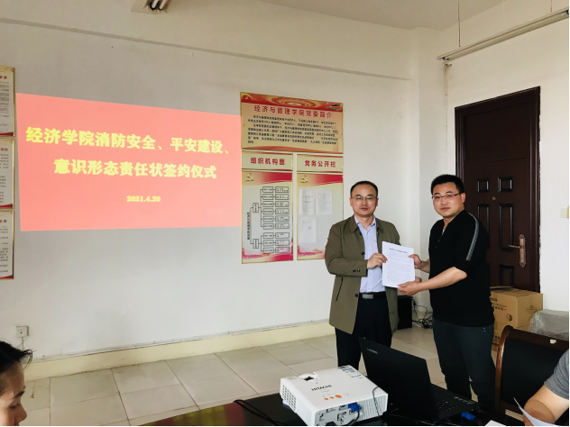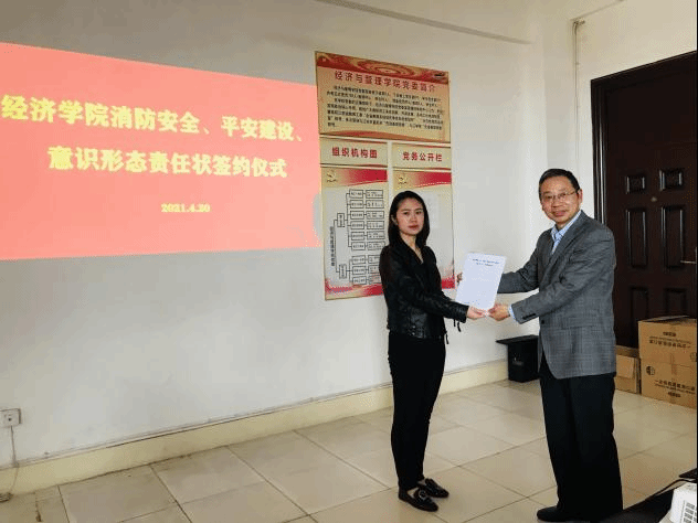 为加强学院意识形态工作建设、平安建设及消防安全管理工作,明确主体责任,保障学院安全稳定发展,4月20日下午,经济学院在义丰楼会议室举行bat365在线中国官网登录入口2021年意识形态、消防安全、平安建设工作责任状签订仪式。会议由学院党委书记漆晗东主持。学院党委书记漆晗东、院长项益才与各科室、教研室负责人、支部书记层层签订了2021年度意识形态、消防安全、平安建设工作责任状。