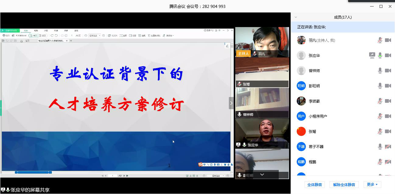 首先由曾祥师主任带领学习了两个“通知”内容精神,强调了专业认证对专业发展的重要性,以及每个教师参与制订培养方案的必要性,并对工作进行了部署,根据培养方案基本框架分四组开展调研和编写工作,每组由5人组成(组长负责)。接着由副主任张应华以“师范类”培养方案修订范例对“基于专业认证的培养方案制订”的内容和要求做了全面的讲解,并和老师们进行了交流。