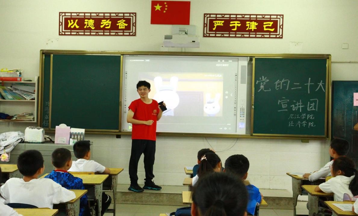 26日上午,实践队为小学生们带去了一堂积极向上的红色主题教育课。在课程开始之前,队员们首先以影片《那年那兔那些事》导入,通过动画激发学生对本堂红色文化课的兴趣,同时引入本次课程的主要内容,用一个个红色文化故事,带领孩子们回顾了党的百年风雨岁月,学习党的二十大精神。在学习交流环节,有一位小学生说到:“我们现在生活在和平年代,有良好的生活环境,我们必须好好珍惜这来之不易的生活。我们必须铭记历史,好好学习,长大为社会做出应有的贡献。”最后,队员们带领小朋友们一起合唱歌曲《童心向党》,在童真的歌曲中,让党的二十大精神走入儿童的心灵,让红色基因、革命薪火代代相传。