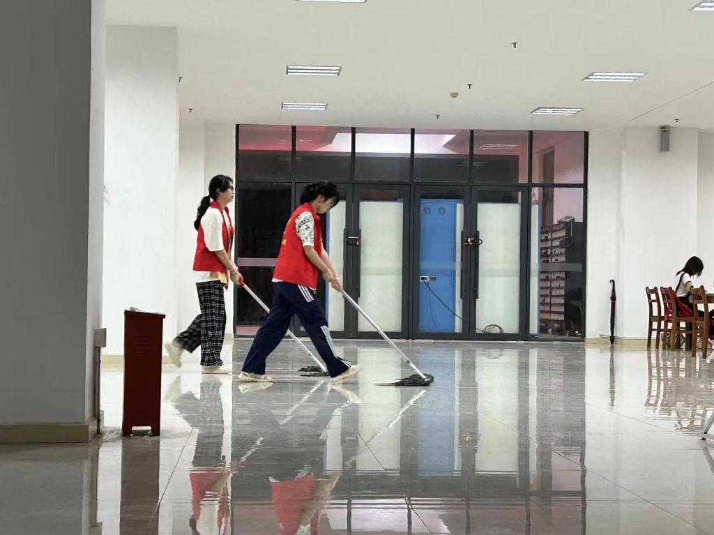 活动开始,图书馆老师根据志愿者人数,对志愿者们进行分工。在明确自己的工作内容,取到工具后志愿者们陆续到达自己的工作区域,井然有序、安静细心的对图书馆进行清扫。本次志愿活动的工作内容是清扫一楼大厅和楼层的地面,志愿者们分工明确、配合默契。用干净的抹布擦拭书架,扫地、拖地、清理垃圾有条不紊。在志愿者的努力下,图书馆变得更加干净整洁。清扫辛苦,但却没有抱怨,脸上都洋溢着灿烂的微笑,齐心协力为同学们营造了一个干净舒适的阅读和学习环境。