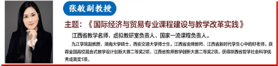 江西省教学名师,虚拟教研室负责人、国家一流课程负责人张敏,汇报了虚拟教研室前期建设工作,并分享了国家一流课程《外贸商品学》课程建设的经验与相关研究成果,进一步促进了与会人员对国贸专业课程建设的深入思考。