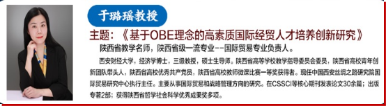 陕西省教学名师,陕西省级一流专业——国际贸易专业负责人于璐瑶教授分享了课程建设经验,并指出了当前国贸专业在人才培养过程中存在的一些主要问题,并就如何解决这些问题进行了经验分享。