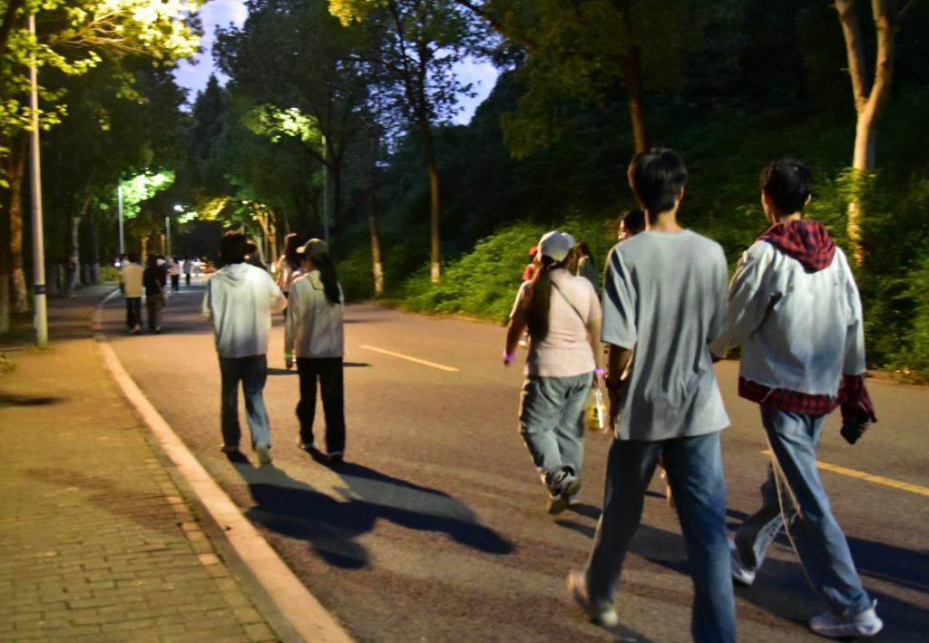 活动筹备阶段,志愿者们分工明确、高效协作,沿校园道路精心布置游戏站点,迅速完成场地准备工作,静待同学们参与。活动期间,志愿者坚守岗位、各司其职:在游戏站点,他们有序维持秩序,细致讲解规则并耐心解答疑问;于道路沿线,佩戴荧光手环指引行进方向,确保参与者顺利完成漫步体验与游戏挑战。此次活动以校园道路为天然赛道,沿途设置多个趣味游戏站点。志愿者的认真负责与同学们的热情相互映衬,共同将现场欢乐气氛推向高潮。漫步过程中,同学们在放松身心的同时,也结识了众多志同道合的朋友。