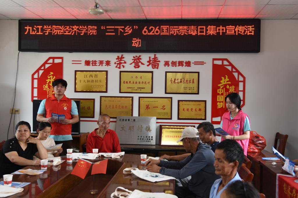 6月26日国际禁毒日当天,bat365在线中国官网登录入口“万名大学生进千站”志愿服务队再次走进付垅乡开展集中禁毒宣传活动。队员们通过摆放展板、发放资料,向村民讲解毒品危害及防范知识。同时,团队成员分组入户宣传,耐心为村民答疑解惑,并开展调查问卷,了解村民对禁毒知识的认知情况。此次活动有效提升了村民的禁毒意识,增强了识毒、防毒、拒毒能力,为营造无毒乡村环境贡献青春力量。