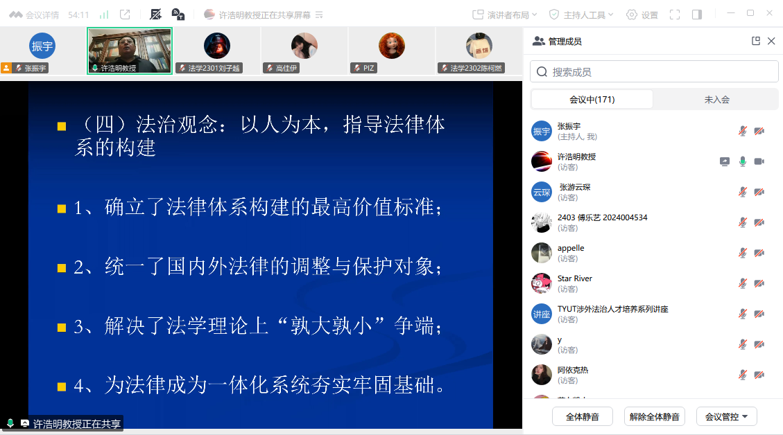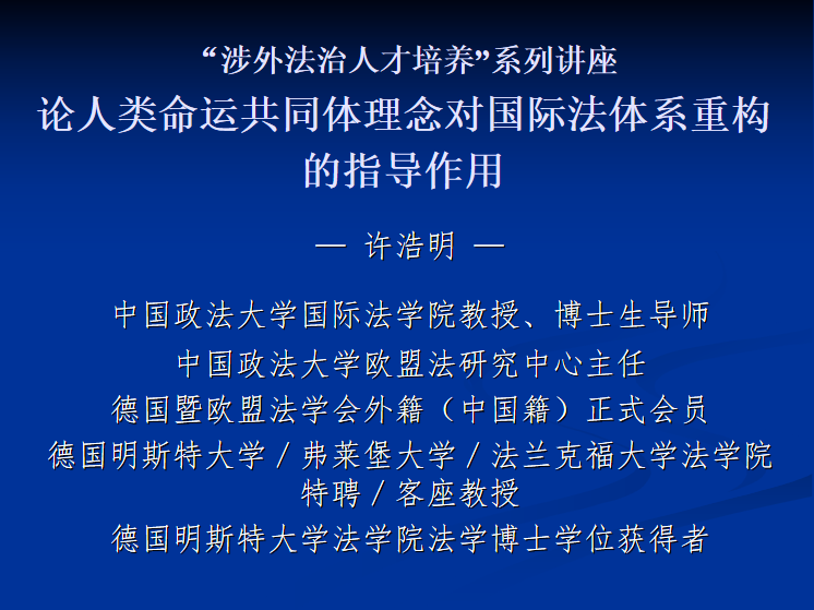 为深入学习贯彻党的二十届三中全会精神,进一步丰富涉外法治课程教学内涵,9月16日,澳门十大信誉好的网站邀请中国政法大学国际法学院/涉外法治学院博士生导师许浩明教授以《论人类命运共同体理念对国际法体系重构的指导作用》为题作专题讲座(线上)。学院师生170余人参加讲座,法学系党支部书记、博士生导师张振宇副教授主持讲座。