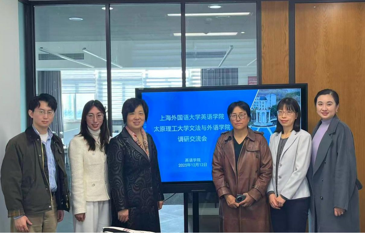 12月12日,调研组赴上海外国语大学虹口校区,与英语学院院长孙会军、党委副书记曹姝婧、翻译系系主任赵璧等进行座谈。座谈会上,孙会军院长对我院一行的到访表示热烈欢迎,并详细介绍了英语学院在卓越人才培养、学科建设及科研创新方面的举措。孙院长结合自身在敦煌学及海外汉学研究领域的丰硕成果,分享了如何利用平行语料库进行深层次文献研究的经验,为我院依托地方特色文化开展科研提供了宝贵思路。翻译系主任赵璧教授分享了在人工智能技术迅猛发展的背景下,教师如何转型发展,以及如何在笔译教学中融入机器翻译评论等前沿研究。曹姝婧副书记就当前外语类专业毕业生的就业形势、升学指导及灵活就业政策解读等方面分享了上外的成熟经验。双方还就新文科背景下大学外语教学改革以及“英语+”复合型人才培养模式进行了交流。