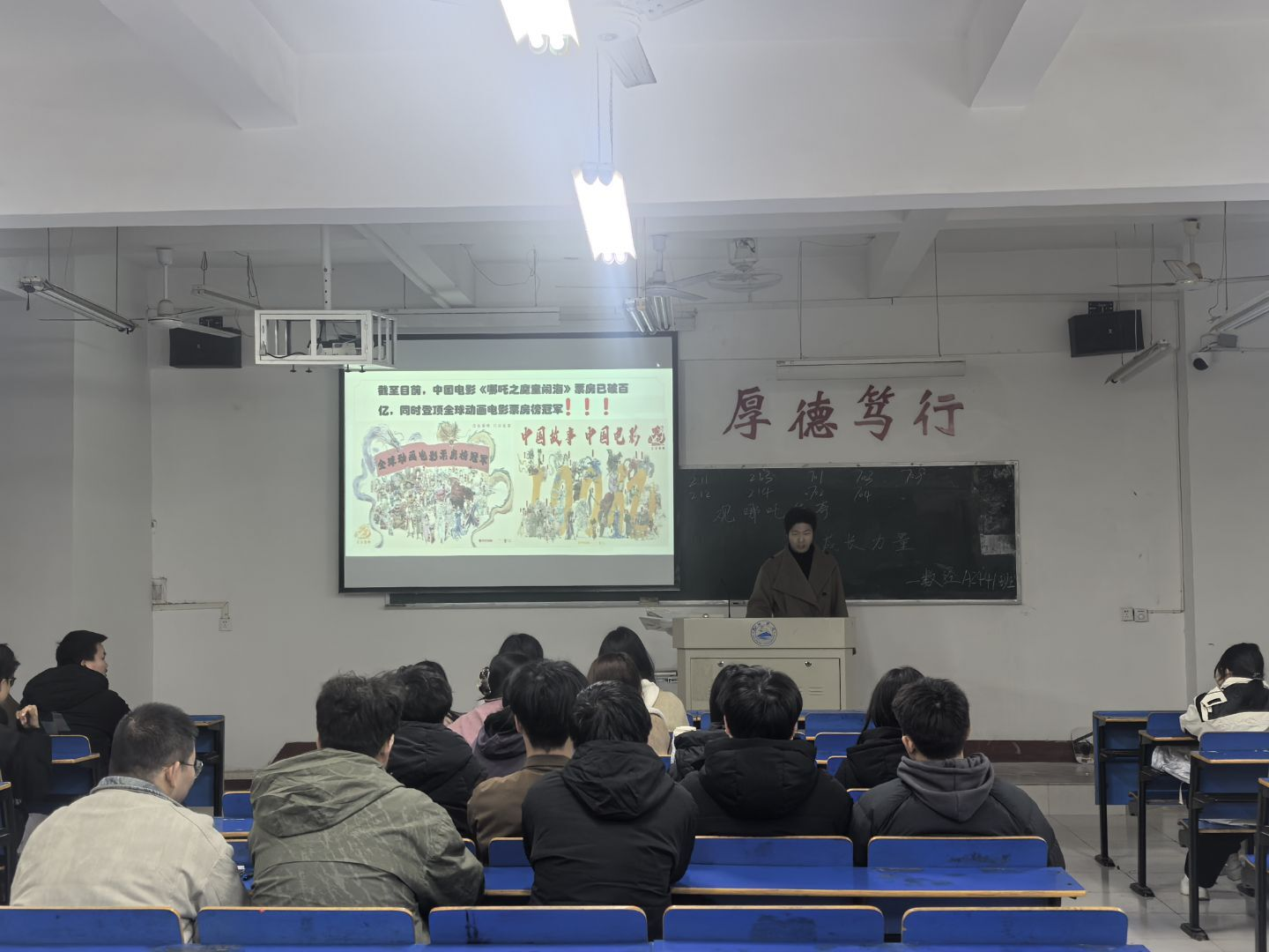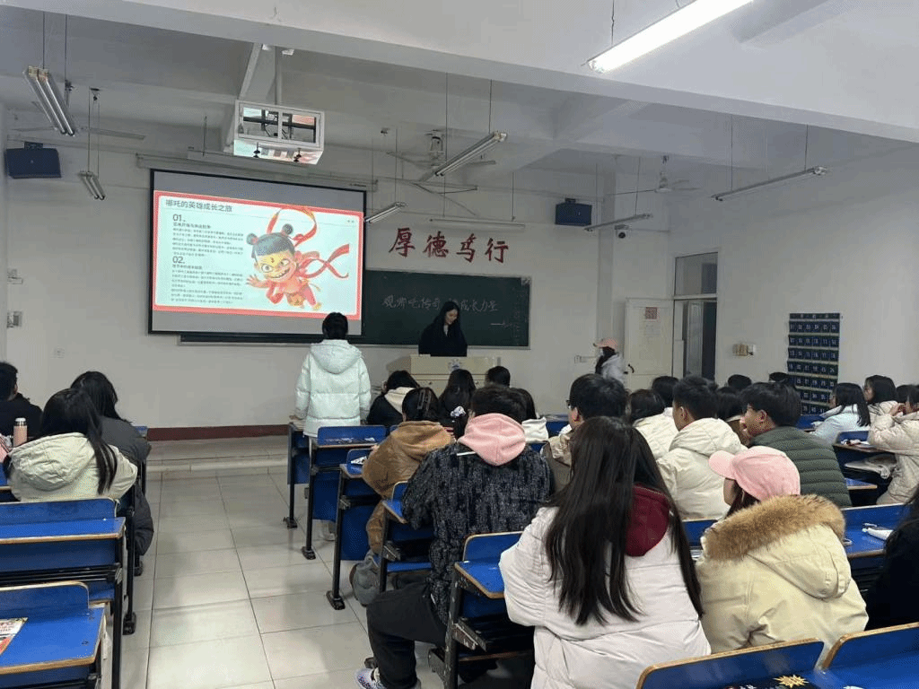 活动伊始,主讲人精心挑选并播放了电影中极具代表性的经典片段。在讲解过程中,主讲人从影片中角色间真挚深厚的友情切入,结合大学宿舍生活、社团活动等场景,深入阐述在集体生活中团结互助的重要意义。随后,主讲人以哪吒对抗命运的情节为引,结合导演饺子以自身多年坚持创作的经历,解释了影片中“不认命、不妥协”的精神内核。同学们深受启发,纷纷表示从哪吒和饺子导演的故事中汲取了力量,在面对困难时有更加坚定的信念。