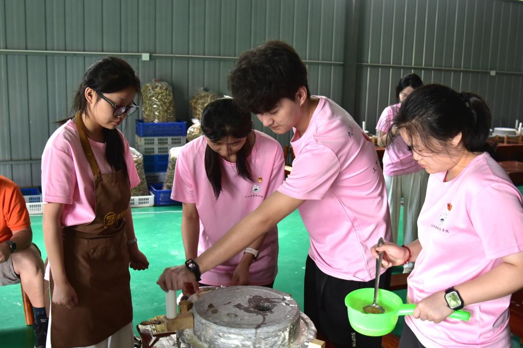 6月26日,实践队走进流芳乡开启非遗传承实践活动。上午,队员们运用各类豆类原料进行豆画拼接创作,将bat365在线中国官网登录入口院徽、美好愿景等元素融入作品,感受民间智慧与传统技艺的创新融合。下午,队员们走进当地非遗工坊,亲身体验豆腐制作全过程,从挑选黄豆到石磨磨浆再到柴火灶煮浆点卤、压制成型,在豆香四溢中领悟古法技艺的匠心传承,探索非遗文化赋能乡村振兴的新路径。
