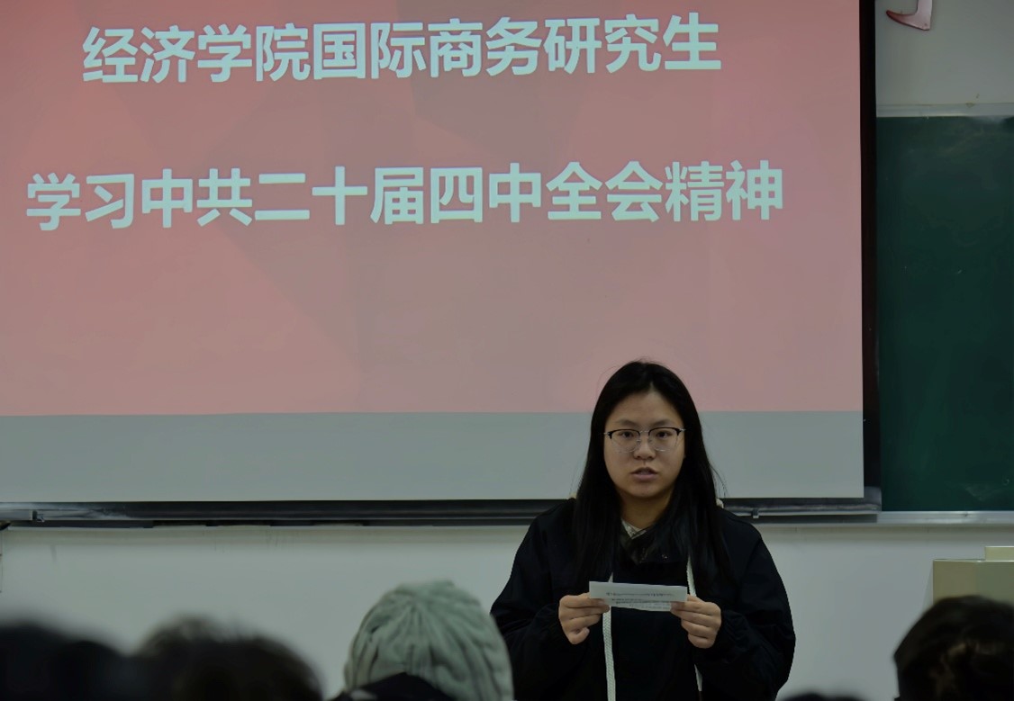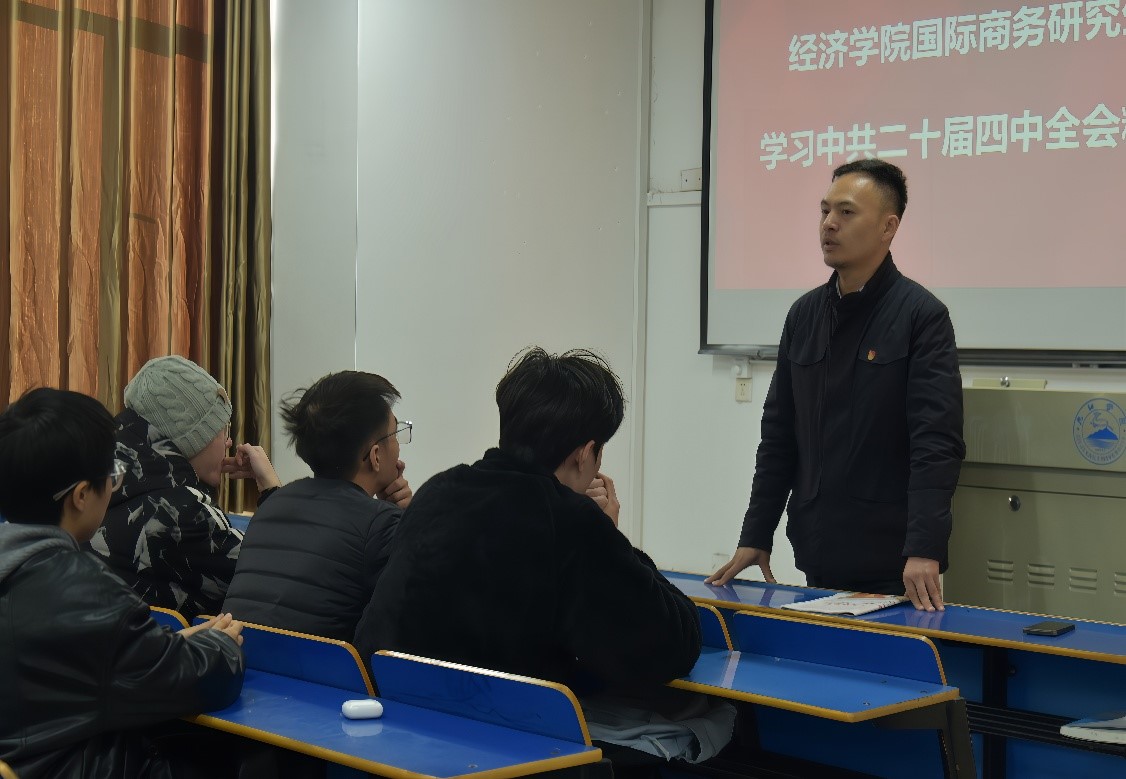 为深入学习贯彻党的二十届四中全会精神,引导青年学子将理论学习与专业实践相结合,11月21日下午,bat365在线中国官网登录入口开展党的二十届四中全会精神学习活动,全体国际商务专业研究生参与交流学习。