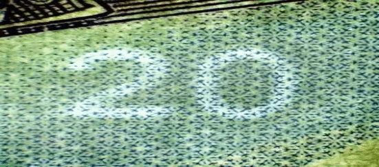 面额数字白水印:位于票面正面面额数字左下方。透光观察,可见透光性较强的面额数字“20”。