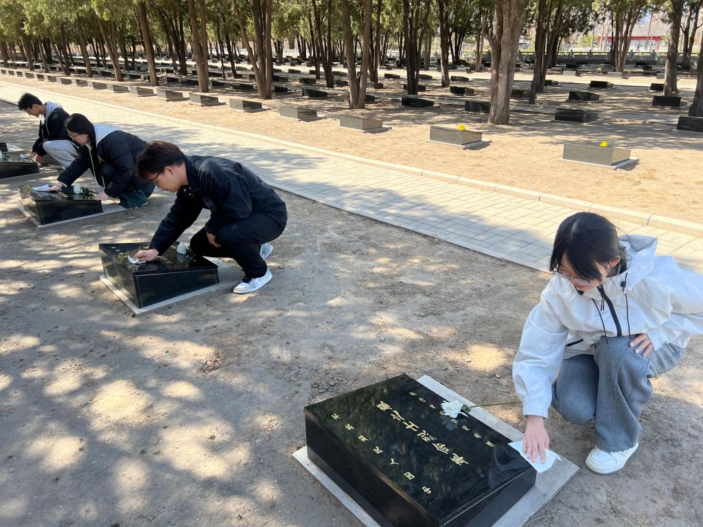 仪式结束后,同学们分组开展烈士墓碑擦拭活动。大家手持纸巾,仔细擦拭每一块墓碑,清理周围的落叶与尘土。在擦拭过程中,同学们认真阅读碑文,了解烈士们的生平事迹,仿佛在与先烈们进行一场跨越时空的对话。每一块墓碑背后,都有着一段可歌可泣的故事,先烈们为了国家的独立、民族的解放,不惜抛头颅、洒热血,他们的奉献和牺牲,让同学们深受触动。
